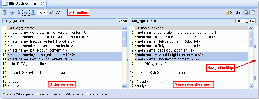 The navigation map, to the right of the vertical scroll bar, shows the relative locations and sizes of the areas that differ between the two files. It uses the same color-coding as the difference sections. Click on any point within the navigation map to scroll directly to that area in the file.The right side of the toolbar contains two buttons that allow you to toggle betweenContext Diff and