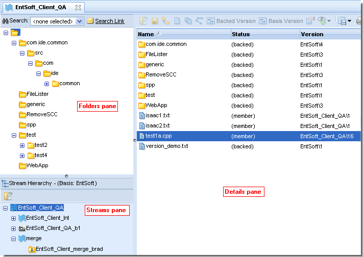 When a File Browser tab opens, the root of the current stream () is shown in the Folders pane (see Folders Pane). From there you can navigate to a location of interest. The Details pane (see Details Pane) displays the contents of a particular directory (folder) selected in the Folders pane, or the results of an AccuRev search that you've selected from the Search drop-down list. The Streams pane (see Code Review) displays a hierarchy of all the children of the stream displayed in the File Browser.