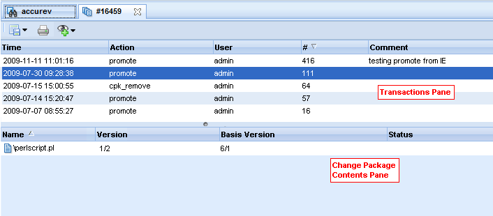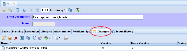 • The Changes Subtab displays the issue record's change package, and provides commands for analyzing and manipulating the change package's entries. To see the change package in a separate tab, click theChange Package History button on the Issue Toolbar. See Change Package History Tab for more information.