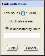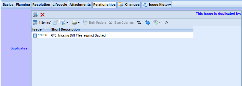 AccuRev supports four types of relationships that can be used to link issues: dependencies, duplicates, subtasks, and tracking issues. Each relationship type has its own section on the Relationships subtab, like the Duplicates section shown here:Use the Remove link command to remove the relationship between the current issue and the selected link. This command is not available before the issue has been saved.Tip: The Delete key on your keyboard also performs the delete action.An attachment field allows you to attach one or more files and/or Internet resource (URLs) to the current issue record. AccuWork displays the attachments data as a table.Defines a new attachment to be the address (URL) of an Internet resource. A New URL dialog box appears, in which you specify a URL and, optionally, a comment string. AccuWork automatically inserts http:// in the URL field. You can replace this with another Internet protocol if necessary.Tip: The Delete key on your keyboard also performs the delete action.The Changes subtab of an issue record's edit form shows the change package of the issue record. You can invoke commands to see the details of the change package's changes, maintain its entries, and view the transaction and version history of its elements.The head version of the change package entry.The basis version of the change package entry.Saves the currently selected file to another filename. See Save As for more information.Tip: The Delete key on your keyboard also performs the remove action.Compares the selected version with the corresponding basis version, revealing what changes were made to the file. Note that comparisons do not work on binary files. See Diff Against Backed or Basis Version for more information.Opens a History Browser tab, which contains the transactions involving the selected element.Displays a message box with information about the selected element. See Displaying Element Properties for more information.If enabled by your AccuRev administrator, allows you to create a code review for the selected file, or add files to an existing code review. See Creating a Crucible Review for AccuRev Elements on page 53 for more information.The Change Package History tab displays the transactions that are part of the current issue's change package. Transactions are displayed in the transactions pane. The change package—all the items associated with a specific transaction—are displayed in the change package contents pane when you select a transaction in the transaction pane. The change package contents pane displays the file name, version, basis version, and status for each element in the change package.