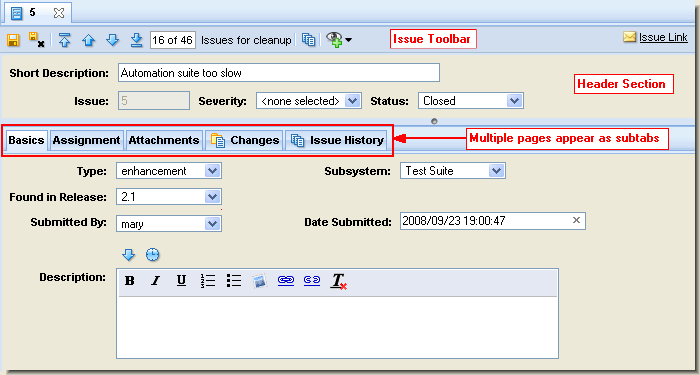 • The Issue Edit form consists of one or more pages, which appear as subtabs within the overall issue tab. Examples of subtabs in the preceding illustration include Basics, Assignment, and Changes.