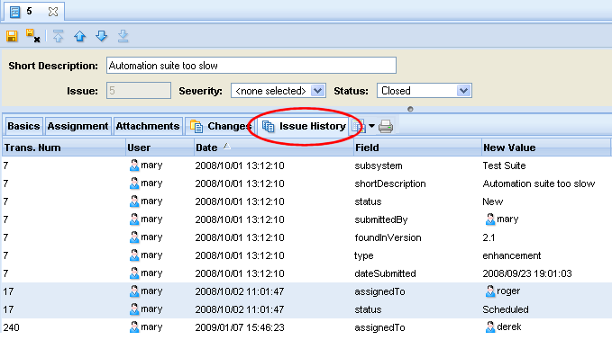 • The Issue History Subtab displays details of how the issue record's field values have changed over time.
