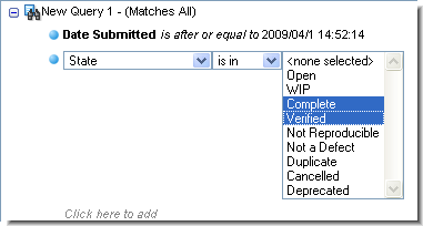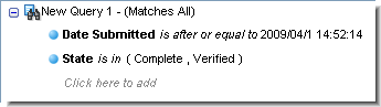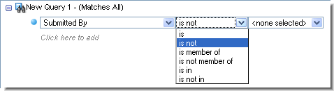8. The query builder is the tool you use to add and modify clauses in new and existing queries. This section describes editing operations supported by the query builder.The point-and-click interface makes creating a simple clause easy. Start by clicking one of the Click here to add links in the query to add placeholders for each part of the clause.First, select a field name from the list box containing all the field names. When you select the field name, the Query Editor automatically adjusts the available values for the other parts of the clause, based on the values allowed (see Allowed Comparisons and Values) for the selected field.In the example below, the user has selected the Submitted By field, and is contemplating which comparison operator to choose.Note that the comparison operators <is in> and <is not in> allow multiple values to be selected. After you select the operator, the options appear in a list box, from which you can make multiple selections. The completed clause contains all the selected values, separated by commas, and the individual values are considered to be combined with an OR.Therefore, the query displayed below would be read as "Show all issues for which the date submitted is after or equal to April 1, 2009 at 14:52:14, AND the issue state is Complete or Verified."Note: Date fields contain an icon that inserts the cur_date variable into the value field. This variable ensures that the clause will refer to the current date when the query is being accessed.A compound clause combines any number of simple clauses, using the same logical operator: AND or OR. (The NOT operator is not supported.) You can combine both simple and compound clauses.The query builder automatically creates placeholders for simple clauses, but you must explicitly insert a compound-clause placeholder yourself. To do so, select the query title or an existing AND or OR statement, and click one of theor