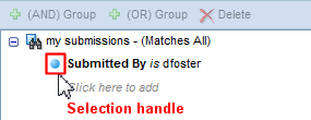 To delete a clause, select it using the selection handle and click the Delete button (). The selection handle is the blue dot that precedes each clause, as shown in the following illustration.