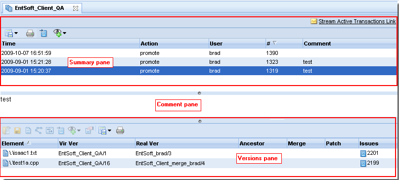 The Show Active Transactions command displays the transactions that contain active elements for the current stream. AccuRev displays the results of this command in the Stream Transactions tab, which consists of three panes—Summary, Comment, and Versions—as shown in the following illustration:No transactions will be shown if you invoke Show Active Transactions on a snapshot, since nothing can be promoted to a snapshot.See Obtaining Web UI Links for more information on this topic.See Using AccuWork™ for more information about issues and change packages.If enabled by your AccuRev administrator, allows you to create a code review for the selected file, or add files to an existing code review. See Submitting AccuRev Elements to Code Review on page 48 for more information.To display details for a transaction, select it in the Summary pane. Note that the details shown in the Versions pane show all elements for the transaction, not just the active elements. The Versions pane lists the file name, version, basis version, and other information for each element in the transaction.Using the Open Commands the selected file.Opens the Version Browser, showing the version in the context of its ancestors (and children, if any).Opens the Diffing Files in AccuRev® and shows the changes in selected file caused by that transaction alone.See Using AccuWork™ for more information about issues and change packages.If enabled by your AccuRev administrator, allows you to create a code review for the selected file, or add files to an existing code review. See Submitting AccuRev Elements to Code Review on page 48 for more information.
