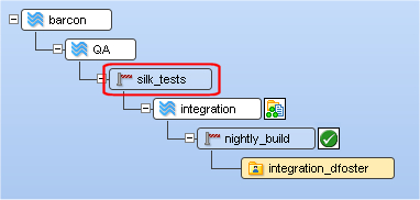 You can use multiple gated streams in your stream hierarchy. In the barcon stream hierarchy, for example, the administrator has decided to add a second gated stream, this one in front of the QA stream to ensure that any changes promoted out of the integration stream pass a suite of tests on the Silk Test platform.