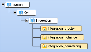 The barcon depot uses a stream hierarchy that might look familiar to many software development organizations. It contains a product release stream, barcon; a QA stream for testing; and a build stream, integration. Individual developers dfoster, oarmstrong, and hchance have workspaces off the integration stream.