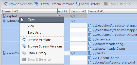 The Stream Diff (Files) tab contains a table, each row of which details one element. Above the table is the name of the Destination Stream (the one you selected with themouse pointer) and Source Stream (the one you selected before invoking the command).