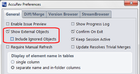 If you also want AccuRev to display ignored external objects, select the Include Ignored Objects preference, too.