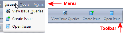 The main way to access AccuWork functionality is from the either the Issues menu or the AccuRev toolbar: