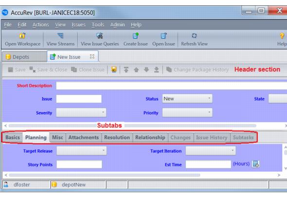 This section describes the layout and features of the AccuWork Issue form. To learn how to create, clone, and modify AccuWork issues, see Working with Issues.