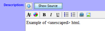 Show Source button Displays the HTML source for formatted text. When clicked, the button text changes to Hide Source. Clicking the Hide Source button reverts the display to formatted text only.