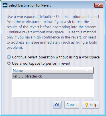 Important: If no valid workspaces exist, this dialog is bypassed and you are prompted whether or not to proceed without a workspace (see below). A "valid" workspace is one of your own workspaces which has local (or accessible mounted) storage on the machine that the revert is being performed from. If none of your workspaces are attached to the stream the issue is being reverted from, or for some reason are not accessible from the machine that the client is running on, you can still proceed with the revert, keeping the new file versions directly in the stream. However, AccuRev warns you that this is what happening if you choose to proceed with the revert operation.