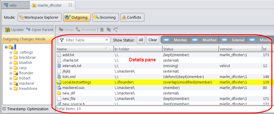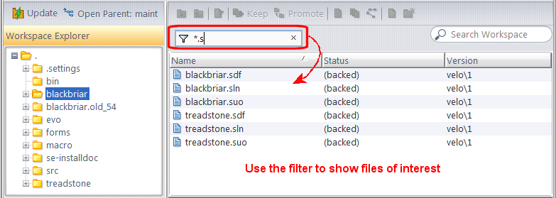 Tip: The results of the Filter Table field are temporary -- AccuRev lets you filter tables independently, from view to view. If you prefer, you can prevent AccuRev from displaying files based on an ignore patterns that you specify. You might want to exclude from view all backup and temporary files, for example. See Controlling the Display of External Objects for more information.