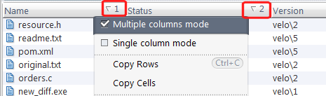 Click another column to make it the secondary sort column. A direction icon annotated with "2" appears in this column, and the rows are reordered according to the two-level sort. Continue in this way to define additional sort levels.