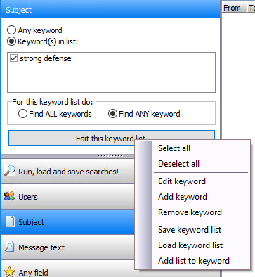 For example, to search for a message that contains the phrase “strong defense”. Select Subject, choose Keyword(s) in list, click on Edit this keyword list, select add keyword.