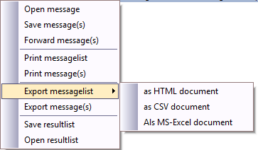 Results can be saved by right-clicking. Note that a range of messages can be selected. Previously saved result list can be opened.