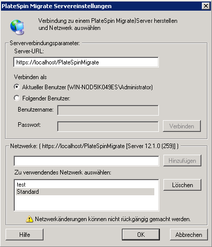 2. Geben Sie die erforderliche PlateSpin-Server-URL, den Benutzer und das Netzwerk ein:
