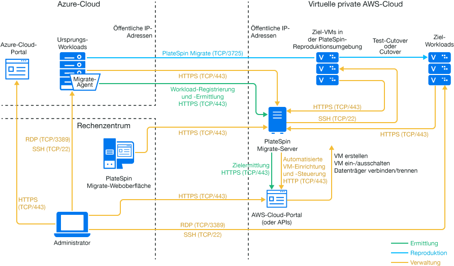 Stellen Sie den PlateSpin Migrate-Server aus AWS Marketplace in der AWS-Zielumgebung bereit. Sie registrieren Workloads über den Migrate Agent am Cloud-basierten Migrate-Server über eine sichere Kommunikation im öffentlichen Internet. Hierfür sind Internetzugriff und öffentliche IP-Adressen erforderlich. Abbildung 12-3 zeigt die Position der verschiedenen Komponenten in der AWS-, Azure- und Rechenzentrums-Migrationsumgebung und die Kommunikation zwischen ihnen.