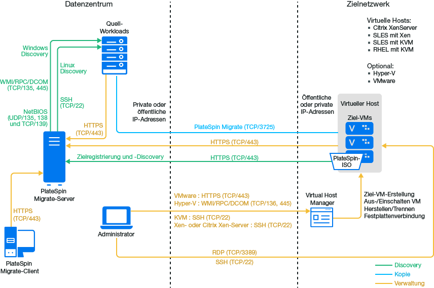 HINWEIS:Abbildung 15-1 zeigt die automatisierte Ermittlung und die Netzwerkanforderungen für Windows- und Linux-Workloads. Alternativ können Sie den Workload mit dem Migrate Agent auf dem Ursprungs-Workload registrieren und seine Inventardetails per HTTPS (TCP/443) an den PlateSpin Migrate-Server senden. Weitere Informationen hierzu finden Sie unter Abschnitt 2.6.2, Voraussetzungen für die Workload-Registrierung und Abschnitt 22.7, Registrieren von Workloads und Ermitteln der Details im Migrate Agent.
