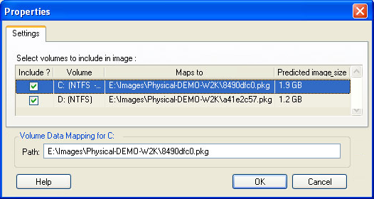 Drive Configuration (Configuración de la unidad): seleccione los volúmenes que desea que PlateSpin Migrate incluya en la imagen y especifique la vía al archivo de paquete (en Drive Configuration [Configuración de la unidad], haga clic en Volumes [Volúmenes]).