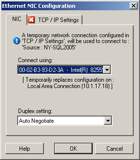 Connect using (Conectar mediante): si hay presentes varios adaptadores de red, seleccione el que pueda comunicarse tanto con el servidor de PlateSpin como con el destino. Duplex setting (Configuración dúplex): use la lista desplegable para seleccionar la transmisión dúplex de la tarjeta de red. Debe coincidir con el valor de transmisión dúplex del conmutador al que está conectada la interfaz de red. Si el origen está conectado a puertos del conmutador definidos para transmisión dúplex de 100 megabits y no se puede cambiar a la negociación automática, seleccione Force NIC to Full Duplex (Forzar NIC a transmisión dúplex). Pestaña TCP/IP Settings (Configuración de TCP/IP): haga clic en la pestaña para acceder a los valores de TCP/IP y a la configuración avanzada de la red. Consulte Configuración de TCP/IP y de red avanzada. |