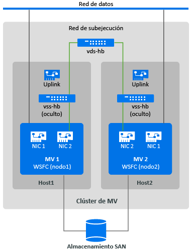 Para crear una red de subejecución, otra opción consiste en configurar un conmutador distribuido de vSphere en el clúster de VMware y añadir un grupo de puertos de la máquina virtual para la red de subejecución en cada conmutador distribuido. Los hosts se añaden al grupo de puertos de subejecución. Con esta configuración resulta más fácil gestionar los valores de red y el grupo de puertos de subejecución en todos los hosts que desee incluir. En los hosts miembros se crean automáticamente conmutadores vSS ocultos. Cada host aporta una NIC disponible, que se usará como enlace ascendente (uplink). Este se necesita para la comunicación entre nodos entre los hosts. Puede configurar la segunda NIC de cada máquina virtual para que use la red de subejecución.