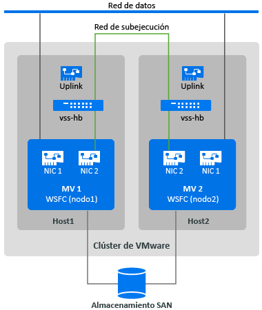 Para crear una red de subejecución, puede configurar conmutadores estándar de vSphere (vSS) de forma idéntica en cada host y añadir un grupo de puertos de la máquina virtual para la red de subejecución en cada conmutador. Cada host aporta una NIC disponible, que se usará como enlace ascendente (uplink). Este se necesita para la comunicación entre nodos entre los hosts. Puede configurar la segunda NIC de cada máquina virtual para que use la red de subejecución.