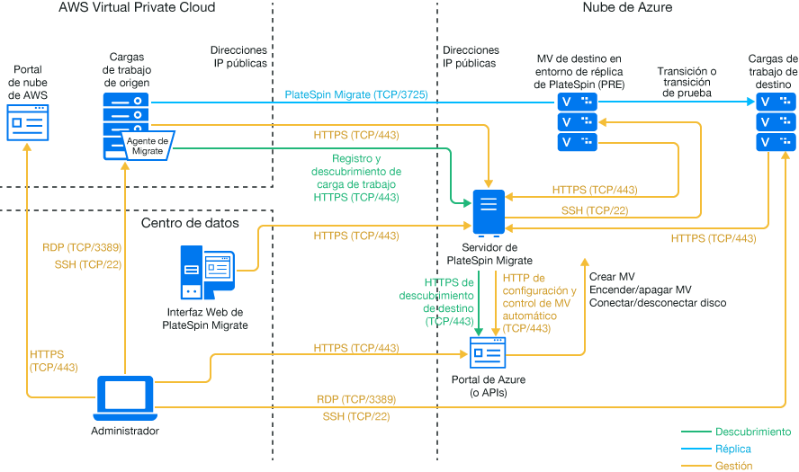Para la migración de cargas de trabajo desde la nube EC2 de Amazon Web Services a la nube de Microsoft Azure, distribuya el servidor de PlateSpin Migrate en el entorno de Azure de destino. No se requiere una VPN entre los sitios participantes. Se requiere acceso a Internet y direcciones IP públicas. La Figura 12-1 muestra la ubicación de varios componentes en los entornos de AWS, Azure y de migración del centro de datos, así como las comunicaciones existentes entre ellos.