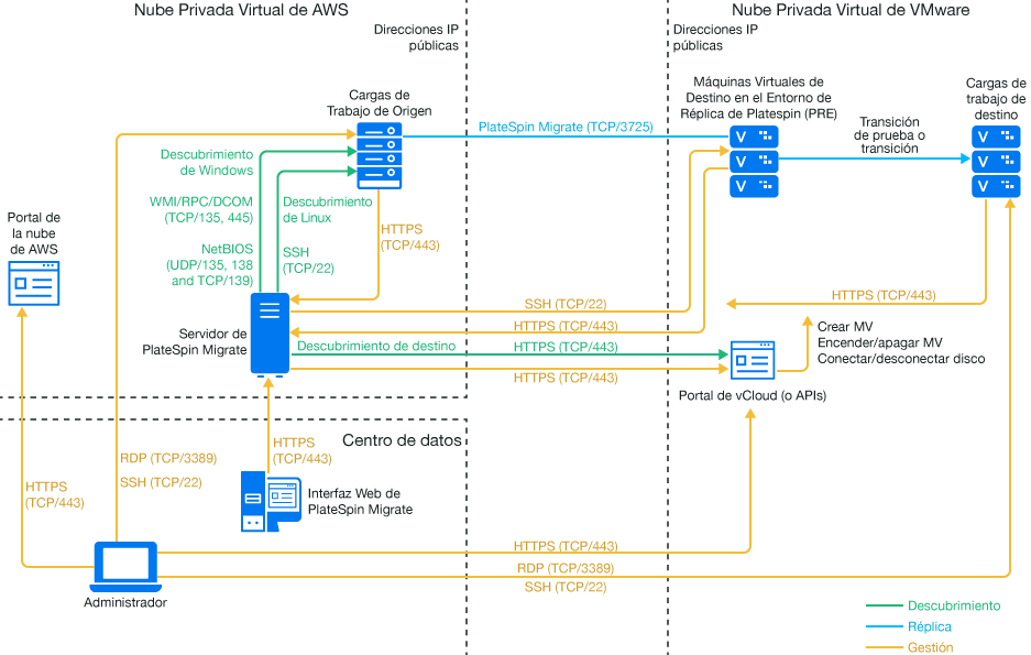 • El agente de Migrate no es necesario porque hay disponible una VPN, pero funcionaría también. Para los puertos de red y los requisitos del cortafuegos para el registro, consulte la Sección 2.6.2, Requisitos para el registro de la carga de trabajo.