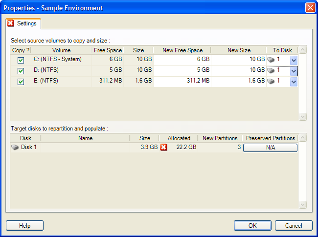 Use estos valores para seleccionar los volúmenes de origen que desea copiar, los espacios de origen que no son de volumen que quiere volver a crear, así como su tamaño, y los discos de destinos que se van a reparticionar y completar.