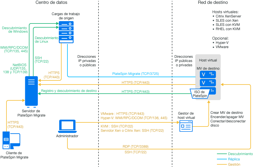 NOTA:la Figura 16-1 muestra el descubrimiento automatizado y los requisitos de red de las cargas de trabajo Windows y Linux. Opcionalmente, puede usar el agente de Migrate en la carga de trabajo de origen para registrar la carga de trabajo y enviar sus datos de inventario al servidor de PlateSpin Migrate mediante HTTPS (TCP/443). Consulte Sección 2.6.2, Requisitos para el registro de la carga de trabajo y Sección 22.7, Registro de cargas de trabajo y descubrimiento de detalles con el agente de Mígrate.