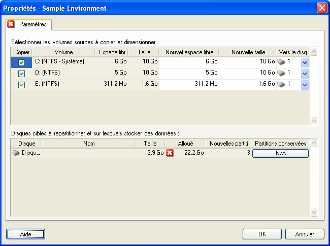 Ces paramètres permettent de sélectionner les volumes sources à copier, les espaces sources (autres que des volumes) à recréer et à dimensionner et les disques cibles à repartitionner et sur lesquels stocker des données.