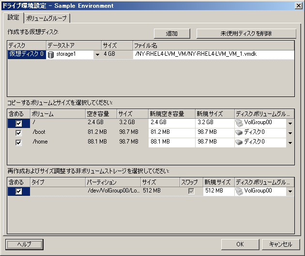 マイグレートするドライブとボリュームの環境設定を指定します。 |