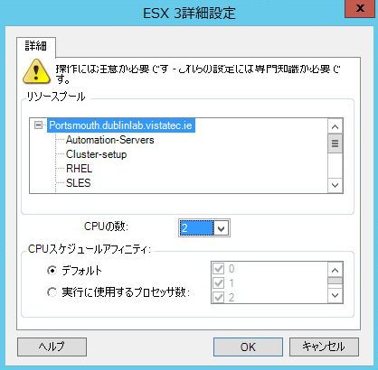 次に、vSphere 5より前のVMware ESXシステムに特有の環境設定オプションを示します。リソースプール、CPUの数、CPUスケジューリングアフィニティを制御する設定にアクセスするには、詳細をクリックします。