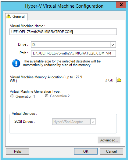 O PlateSpin Migrate exibe as opções de configuração da máquina virtual de destino específicas ao destino selecionado e também concede acesso às opções de configuração avançadas. Para obter informações sobre as opções de configuração específicas do host, consulte Configuração da VM de destino: Microsoft Hyper-V