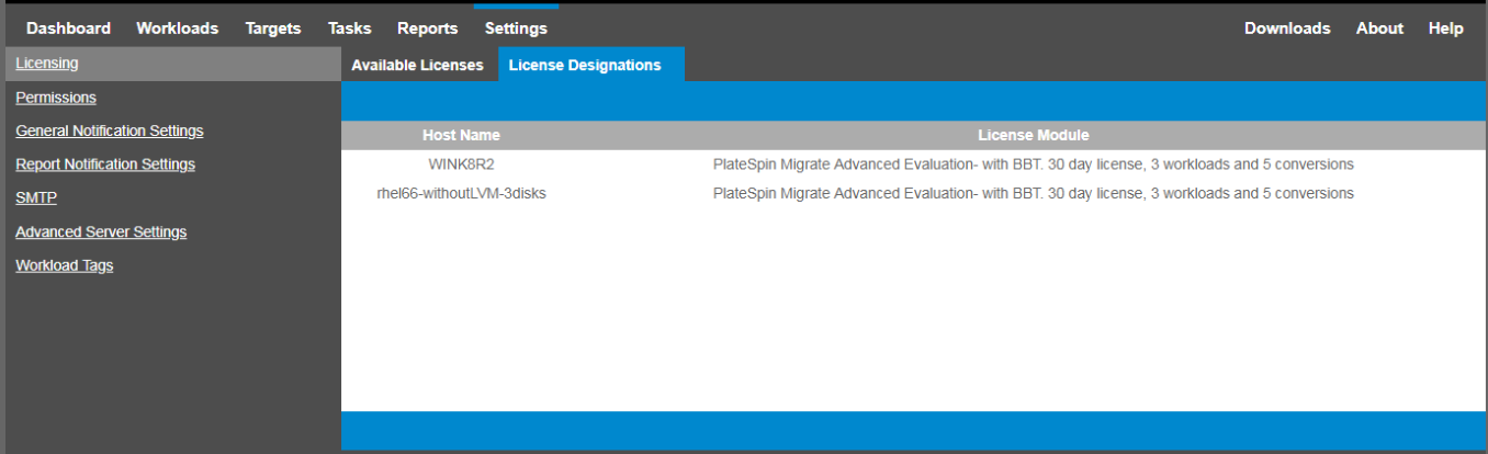 Na Interface da Web do PlateSpin Migrate, clique em Settings > Licensing > License Designations (Configurações > Licenciamento > Designações de Licença) para ver alocações de licença das cargas de trabalho.