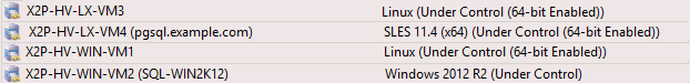 A Figura 3-2 apresenta um exemplo de nomes de host X2P para cargas de trabalho de destino com e sem a presença de um sistema operacional. As cargas de trabalho X2P-HV-LX-VM3 e X2P-HV-WIN-VM1 não têm um sistema operacional subjacente. As informações do LRD são exibidas como o sistema operacional.