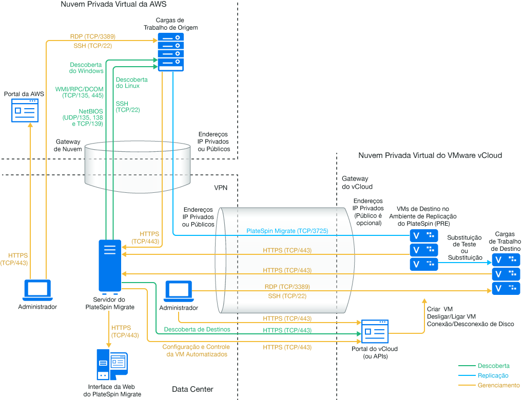 NOTA:A Figura 12-9 mostra as cargas de trabalho de origem e o servidor do Migrate no mesmo grupo de segurança de rede. Se eles estiverem em grupos de segurança diferentes, use o Agente de Migração na carga de trabalho de origem para registrar a carga de trabalho e enviar seus detalhes de inventário ao servidor do PlateSpin Migrate usando HTTPS (TCP/443). Consulte a Seção 2.6.2, Requisitos para o registro de carga de trabalho e a Seção 22.7, Registrando cargas de trabalho e descobrindo detalhes com o Agente de Migração.