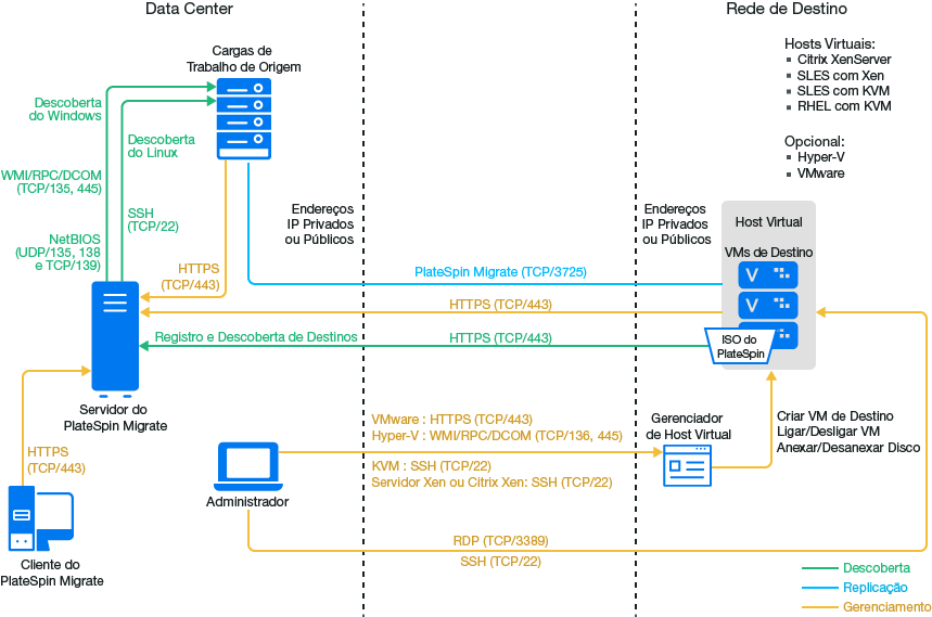 NOTA:A Figura 15-1 ilustra a descoberta automatizada e os requisitos de rede para cargas de trabalho do Windows e do Linux. Se preferir, você poderá usar o Agente de Migração na carga de trabalho de origem para registrar a carga de trabalho e enviar seus detalhes de inventário ao servidor do PlateSpin Migrate usando HTTPS (TCP/443). Consulte a Seção 2.6.2, Requisitos para o registro de carga de trabalho e a Seção 22.7, Registrando cargas de trabalho e descobrindo detalhes com o Agente de Migração.