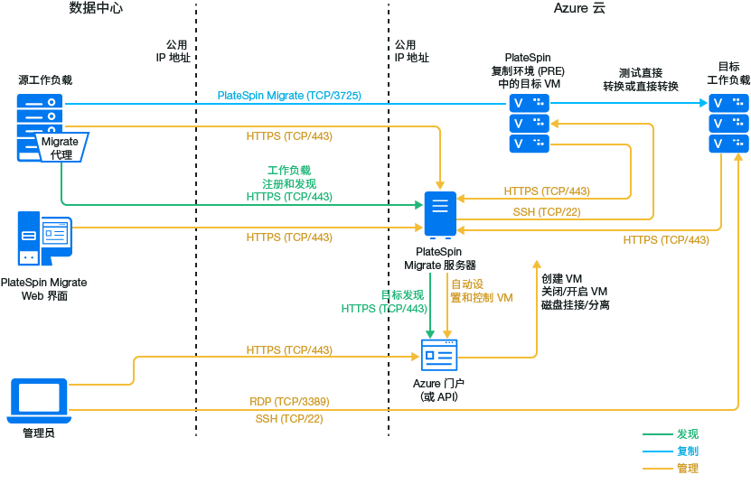 可以将 PlateSpin Migrate 服务器部署在包含源工作负载的数据中心本地,或者部署在相应的 Microsoft Azure 云环境中:全球 Azure 云或中国区主权 Azure 云。