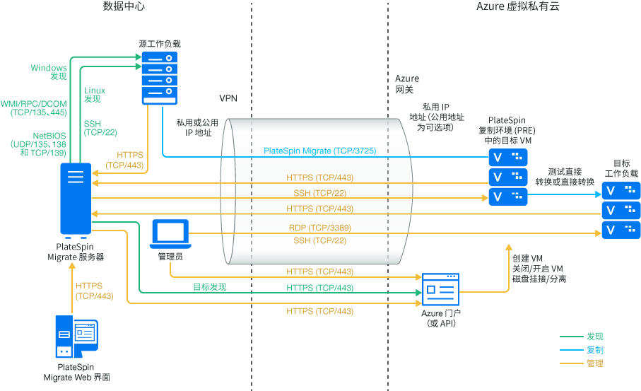 注:图 9-1 描绘了 Windows 和 Linux 工作负载的自动发现和网络要求。您也可以使用源工作负载上的 Migrate 代理来注册工作负载,并使用 HTTPS (TCP/443) 将其库存细节发送到 PlateSpin Migrate 服务器。请参见部分 2.6.2, 工作负载注册的要求部分 22.7, 使用 Migrate 代理注册工作负载并发现细节