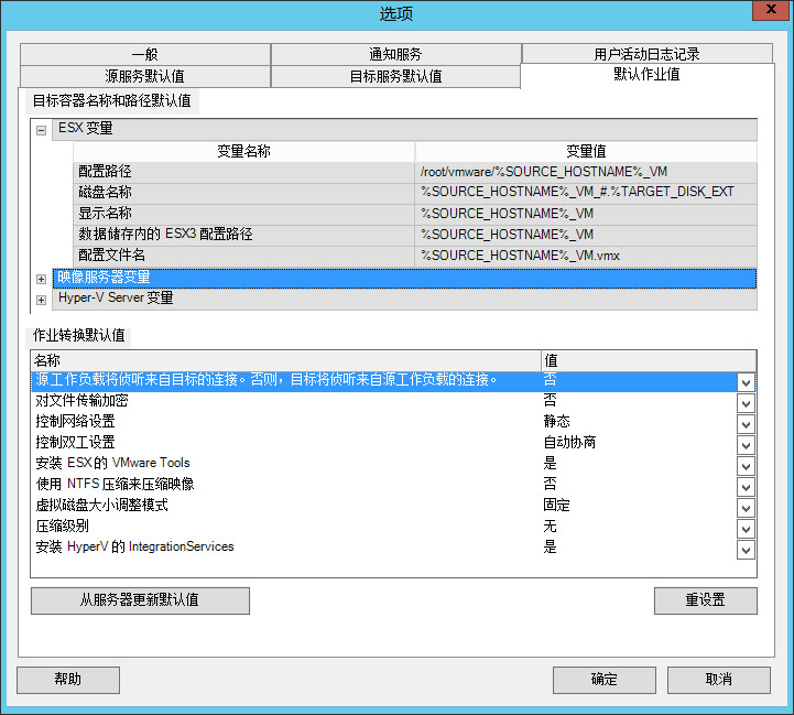 PlateSpin Migrate 客户端可让您指定特定于目标虚拟化平台的默认迁移作业值。