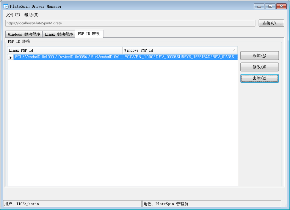 2. 在 Driver Manager 工具中,选择“PNP ID 转换”选项卡以打开 PNP ID 转换列表,该列表中包含当前已知的自定义 PNP ID 映射。