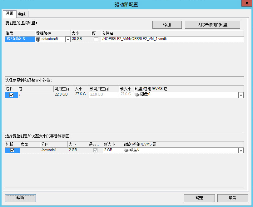 添加卷组:在目标计算机上创建源计算机中不存在的卷组。 重命名卷组:重命名正在从源复制到目标的卷组。 删除卷组:删除某个卷组,这样就不会在目标计算机上创建该卷组。可以使用设置选项卡将指派到卷组的卷重指派到其他位置(默认情况下,这些卷将指派到磁盘)。 卷组分配:要将磁盘上的空间分配到某个卷组,请选择该卷组,然后选择要包含在该卷组中的磁盘。指定包含在卷组中的每个磁盘上要分配到该卷组的空间容量。 |