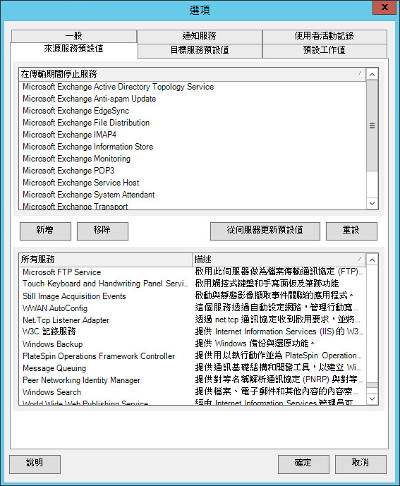 在傳輸期間停止服務區段︰列出預設會停止的服務。若要依預設於使用特定傳輸方法的資料傳輸期間停止某項服務,請選中相應的核取方塊。取消選中核取方塊則表示該服務在即時傳輸期間仍保持使用中狀態。 所有服務區段︰列出所有探查到的機器上的唯一服務。按一下新增可將選取的服務從下方區段新增至上方區段,並設定為在移轉期間將其停止。 從伺服器更新預設值︰從 PlateSpin 伺服器擷取預設值。 |
