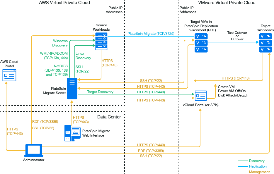PlateSpin Migrate supports migration of workloads from Amazon Web Services EC2 Cloud to VMware vCloud Director.