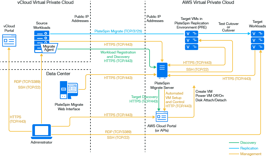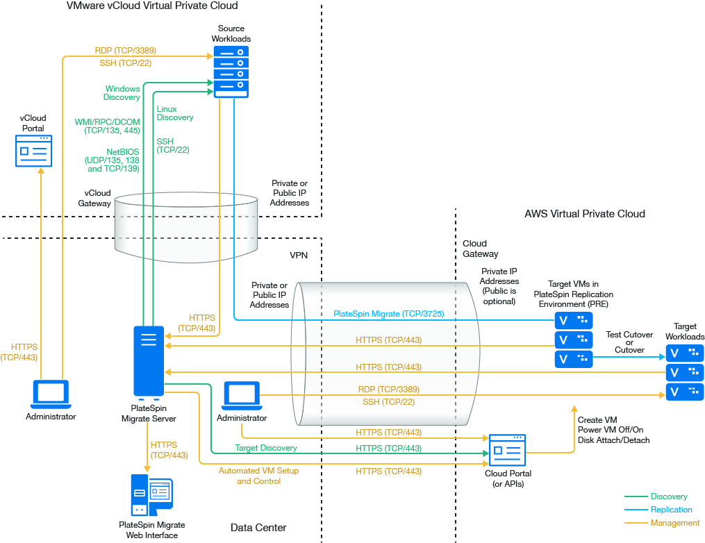 For migration of workloads from VMware vCloud Director to Amazon Web Services EC2 Cloud, deploy a PlateSpin Migrate server on premise in your source network. VPN gateways are required between the data center and AWS and between the data center and vCloud. Figure 12-10 shows the location of various components in your AWS, vCloud, and data center migration environments and the communications between them.
