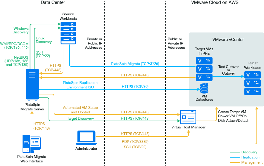 NOTE:Figure 13-1 depicts automated discovery and the network requirements for Windows and Linux workloads. You can alternatively use Migrate Agent on the source workload to register the workload and send its inventory details to PlateSpin Migrate server using HTTPS (TCP/443). For network requirements when using Migrate Agent, see Section 2.6.2, Requirements for Workload Registration and Section 19.7, Registering Workloads and Discovering Details with Migrate Agent.