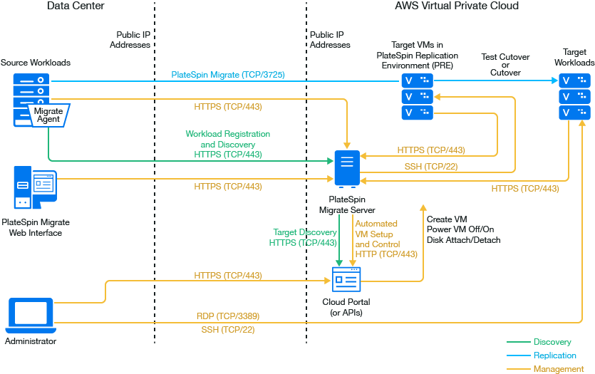 NOTE:Figure 8-1 depicts automated discovery and the network requirements for Windows and Linux workloads. You can alternatively use Migrate Agent on the source workload to register the workload and send its inventory details to PlateSpin Migrate server using HTTPS (TCP/443). See Section 2.6.2, Requirements for Workload Registration.